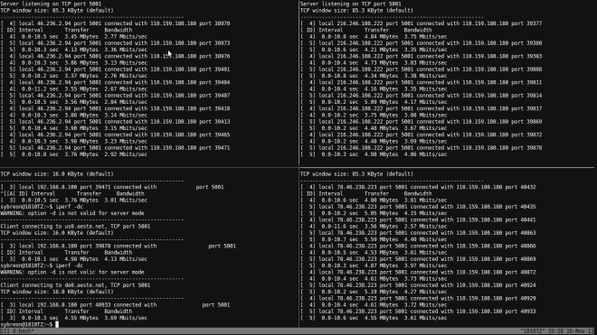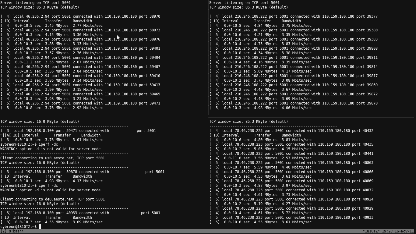 I had ordered the VIP5 package, which comes with a 5Mbps line. Seeing that OOKLA reported a 4.8Mbps speed was quite a good sign. However, instead of just trusting OOKLA, I decided to do a little test of my own. I ran my own iperf tests against my servers in the UK, US and Germany.